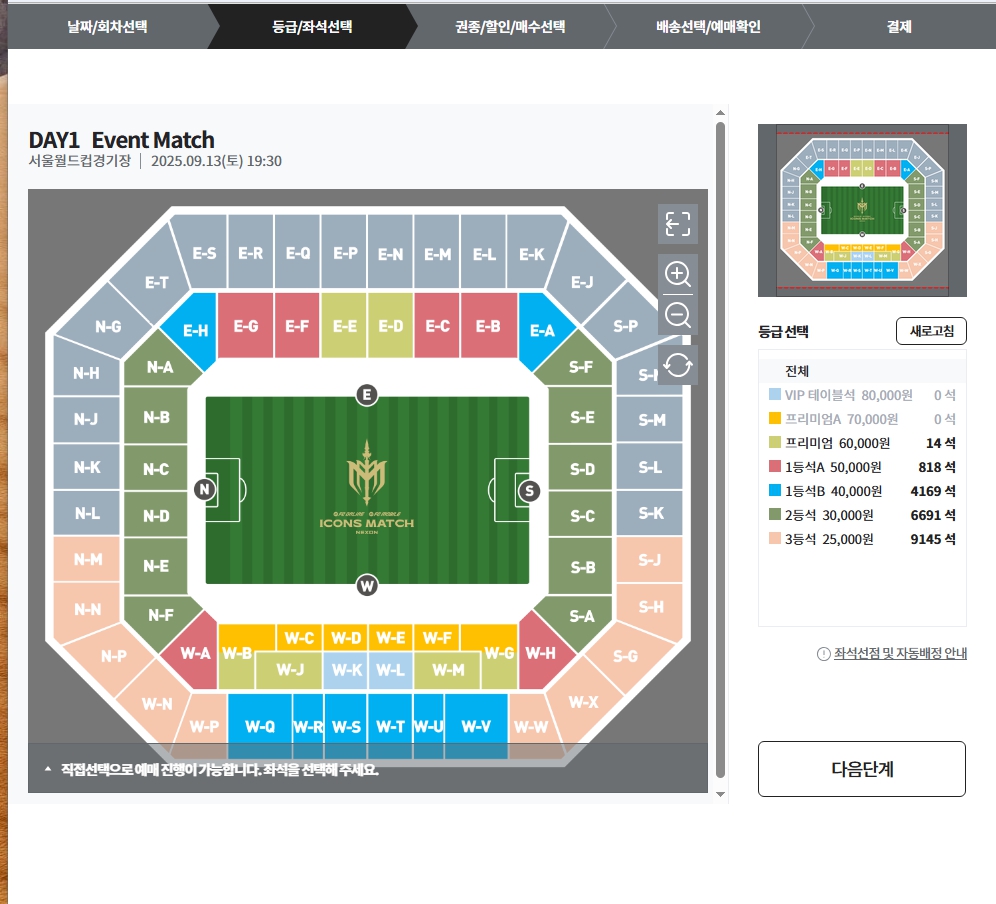 2025 아이콘 매치는 일부 좌석은 매진되었지만, 2025년 8월 26일 기준 여전히 2·3등석 다수 좌석이 남아있습니다.