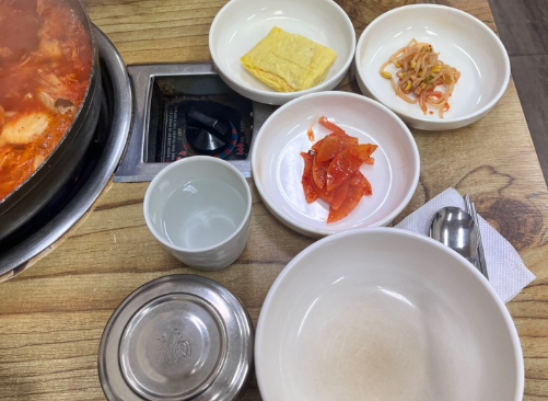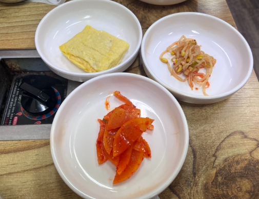 반찬을 먹으며 기다림...반찬은 김치, 계란말이, 어묵 이 나온것 같다. 배가 고파서 반찬도 맛있었다!