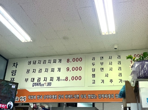 | 부대김치찌개 | 9,000원 | 햄과 소시지가 듬뿍 들어간 푸짐한 김치찌개 |