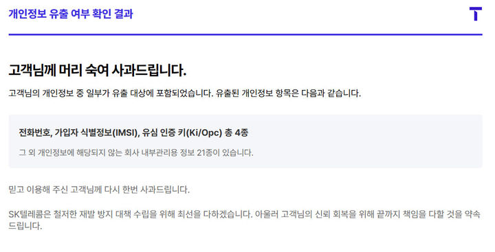 SK텔레콤은 공식 홈페이지와 고객센터를 통해 개인정보 유출 여부를 확인할 수 있는 서비스를 제공하고 있습니다.